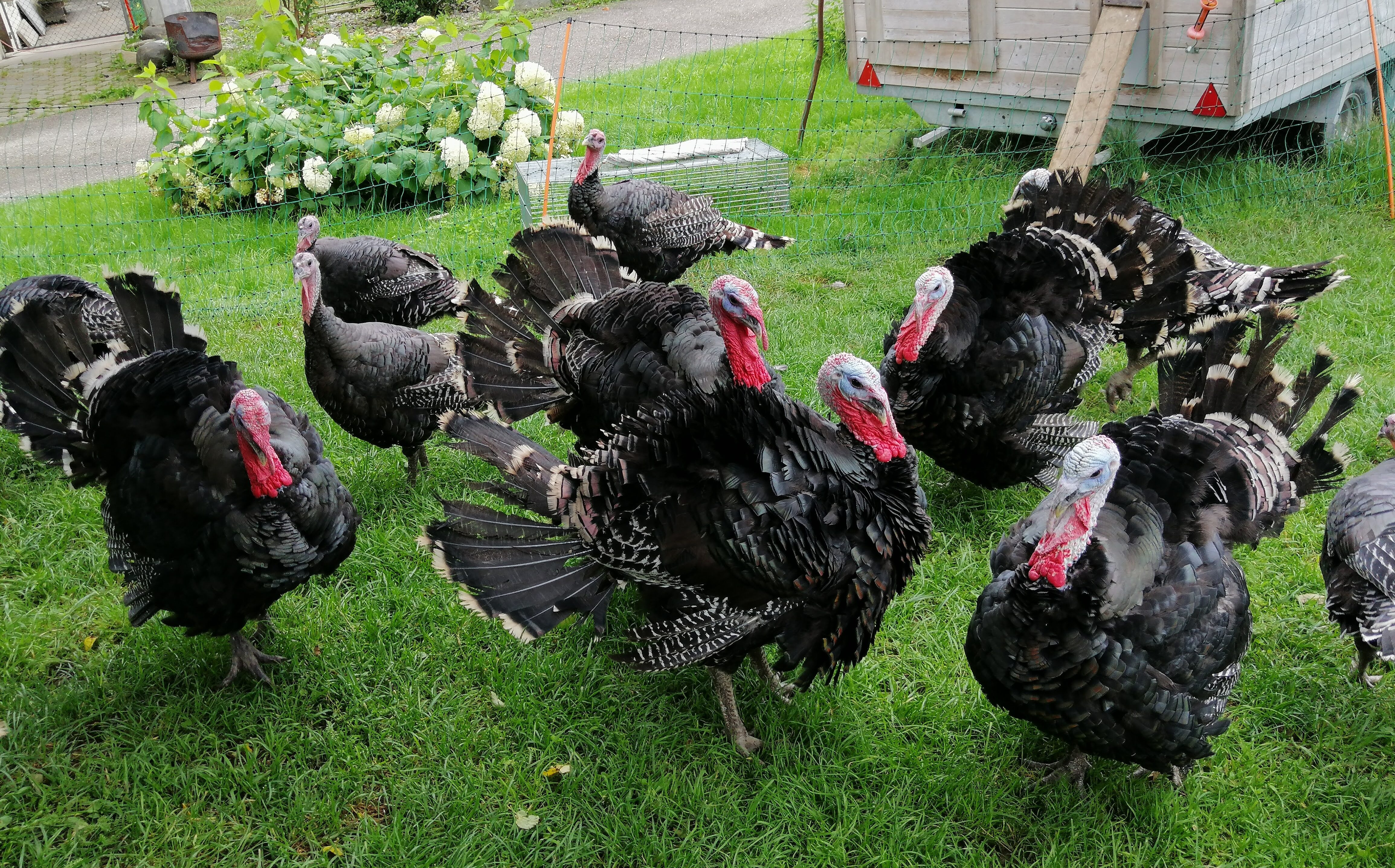 Seit erst drei Jahren gehen wir nicht nur mit den Kühen, sondern auch mit unseren Truten auf die Weide. Während den rund 20 Wochen, die die Tiere bei uns verbringen, fressen sie Gras und Kräuter auf der Weide sowie Getreide und Stroh im Stall.