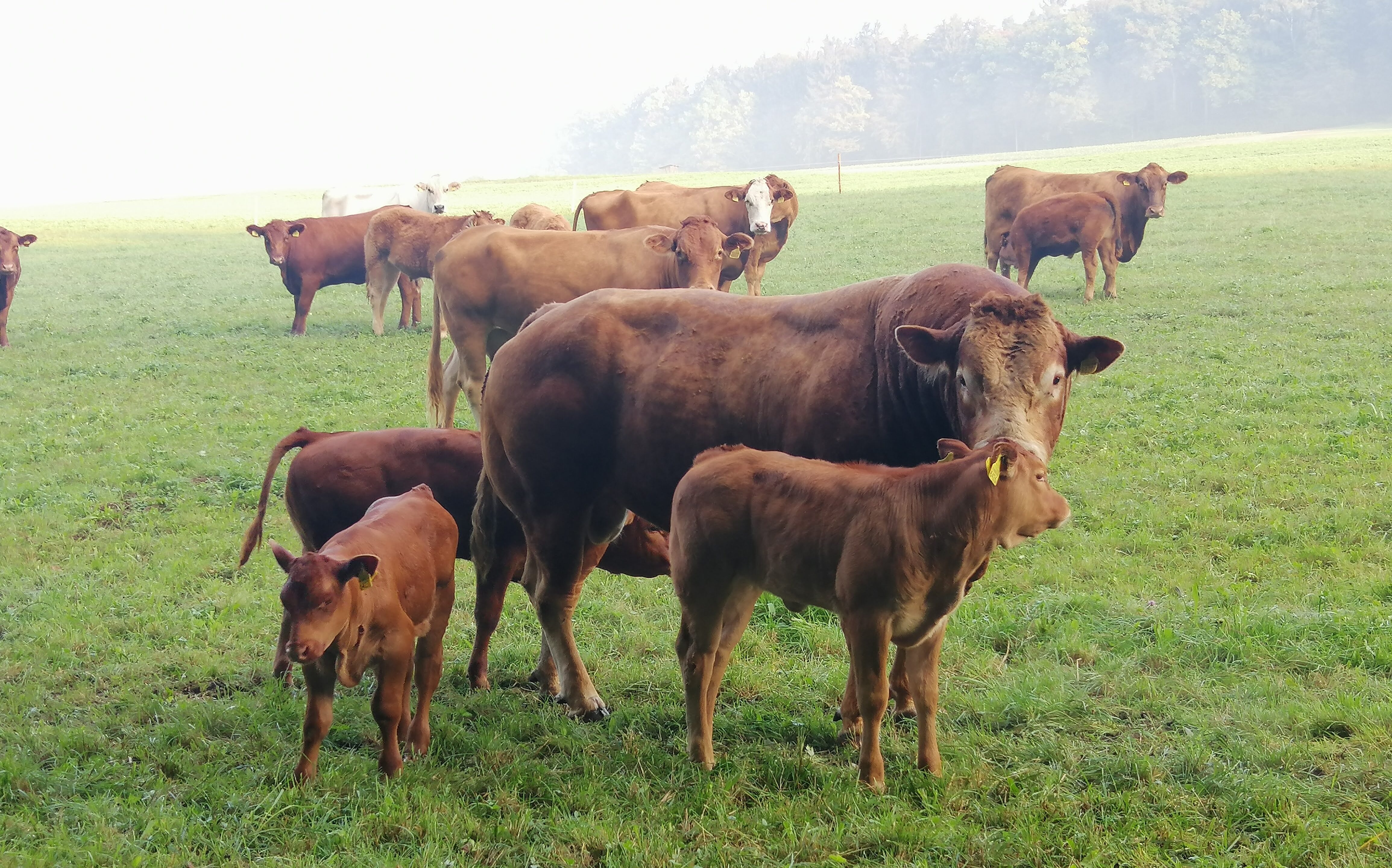 Aktuell haben wir 12 Mutterkühe, einen Stier sowie 12 Kälber. Dazu kommen 120 Truten. Auf ca. 52 Hektaren bauen wir Mais, Weizen, Gersten, Raps, Chicorée und Bohnen an, natürlich alles mit Bio-Zertifizierung.